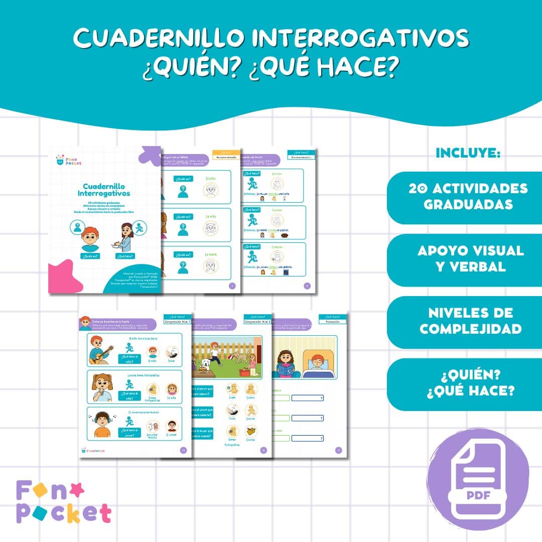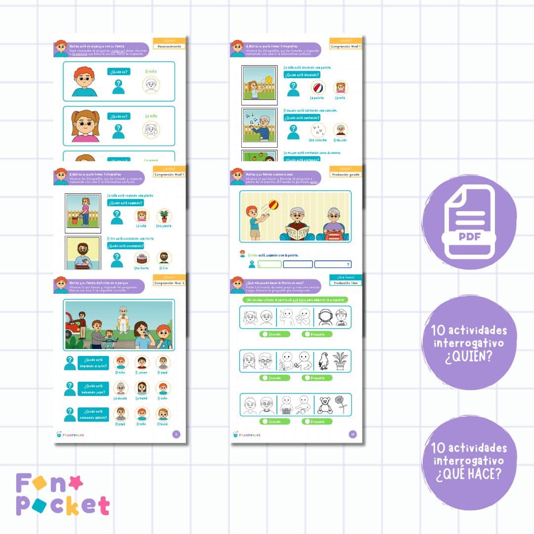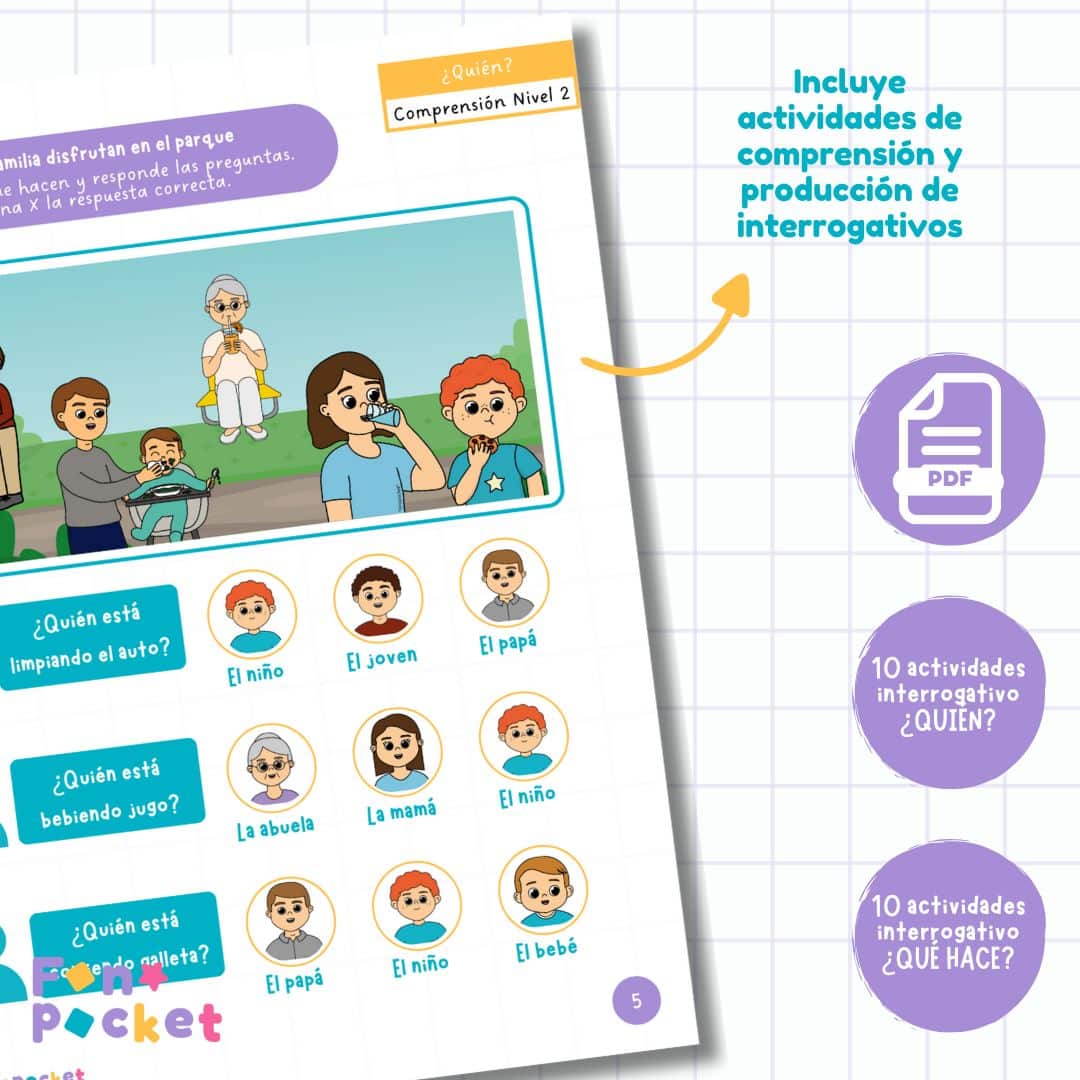 - 10 páginas de actividades para el abordaje de la partícula interrogativa ¿quién?, a nivel de comprensión y producción.
