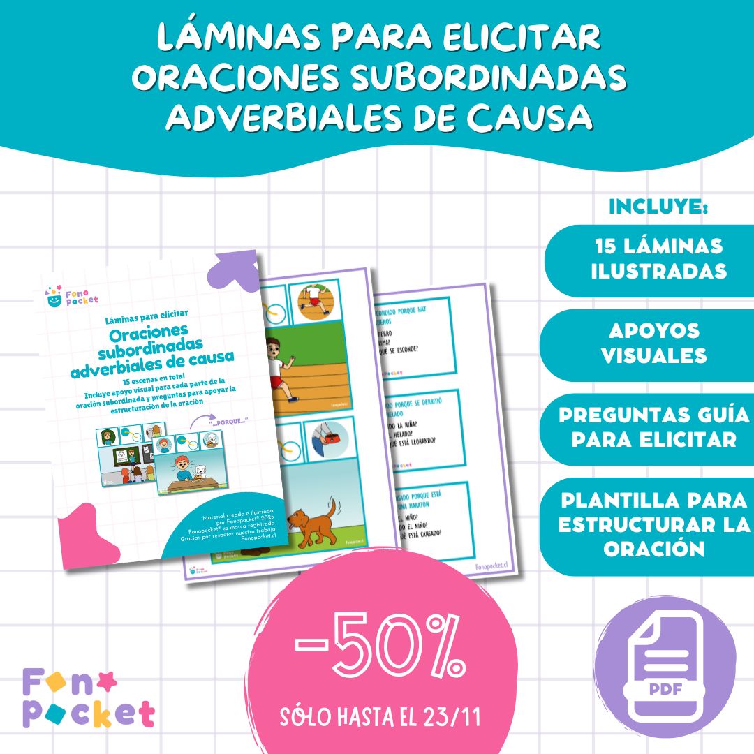 Facilita la producción de oraciones subordinadas adverbiales de causa con este recurso imprimible. Incluye 15 escenas con apoyo visual y un instructivo para su uso y la implementación de estrategias terapéuticas.