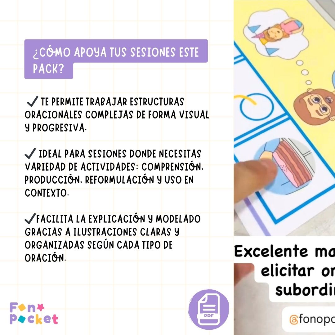 - Para niños y niñas desde los 4 años, que necesiten apoyo para la producción y comprensión de oraciones subordinadas.